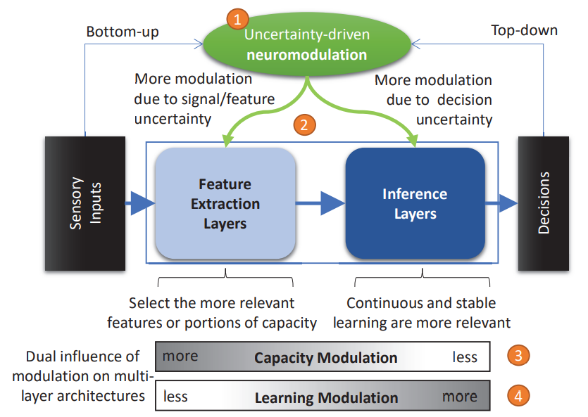 | 不确定性调控容量分配:我们建议研究神经调控在上调网络部分的激活和学习中的作用,这些部分可以最佳地解决特定任务并抑制那些无助于减少不确定性的部分。 | 构建具有非常大容量的网络来支持终身学习,同时不会因为只激活网络中最能支持任务性能的部分而导致准确性下降。 |