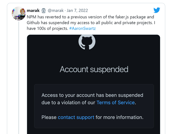 在将这一错误更新推送到 fake .js 的两天后,Marak 发布了一条推文,指出他的账号已被 GitHub 暂停使用,尽管他为该网站上贡献了大量项目。