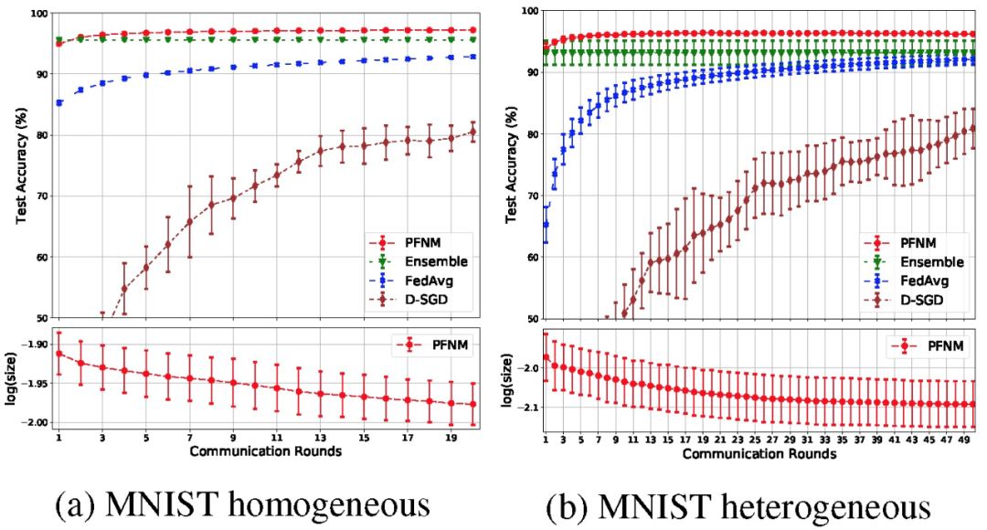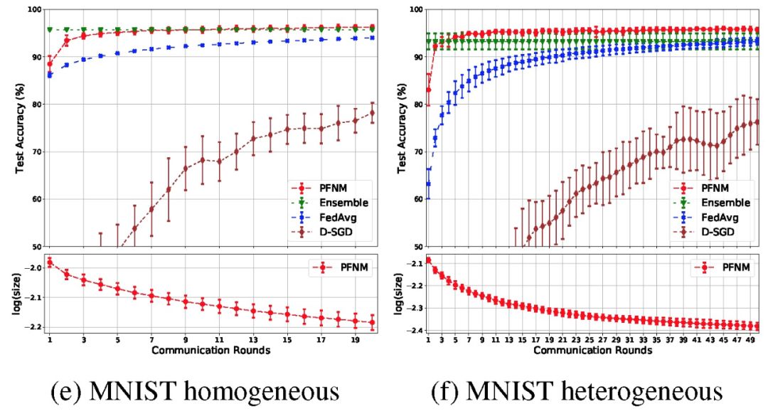 图 4 给出了一层和两层神经网络的结果。在两种实验数据情况下,每层都使用 100 个神经元。在保证足够通信回合的情况下,PFNM 的性能都优于聚合算法。此外,在所有的实验中,与联邦学习和 D-SGD 相比,PFNM 需要较少的通信回合就能达到给定的性能水平。