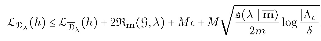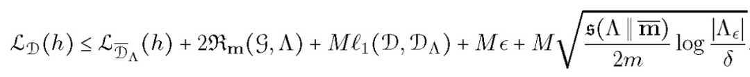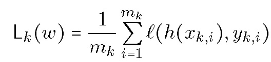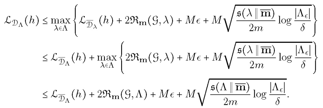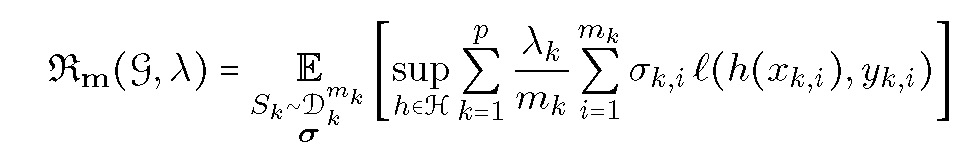 其中 Sk 表示大小为 m_k 的样本,sigma 为 Rademacher 变量集合,这些变量均为 {-1,+1} 范围内的均匀分布随机变量。假设损失函数以 M>0 为界。对于任何大于 0 的 delta,在样本 Sk~Dk.^(m_k) 中以最小(1-delta)的概率抽样,具有下列不等式: