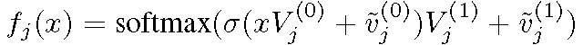 假设训练 J -多层感知器(MLP)j=1,...,J,每个感知器有一个隐藏层。令 V.^(0) 和 v.^(0) 分别表示隐藏层的权重及偏移,V.^(1) 和 v.^(1) 表示 softmax 层的权重和偏移。D 为数据维度,Lj 表示隐层的神经元数量,K 为类别数量。简单的神经网络结构为: