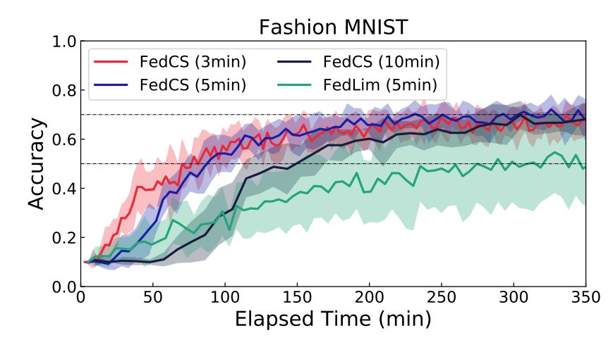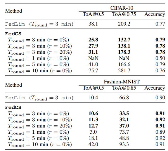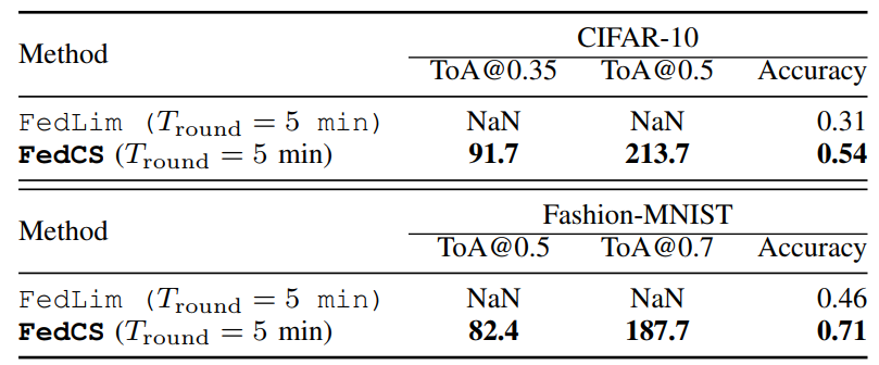 4)评价指标:本文将 FedCS 与经典联邦学习方法(FedLim)进行对比。评价指标包括达到所需精度的时间(ToA@x)、最后期限后的准确度(Accuracy)。