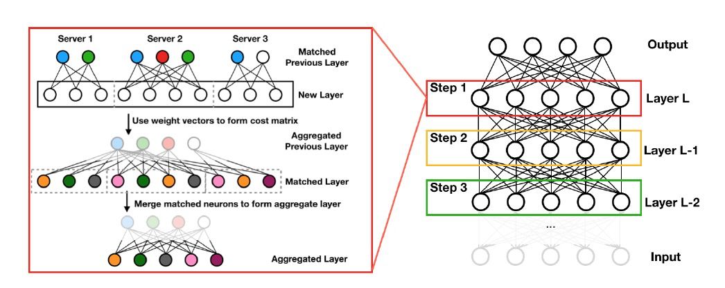 图 2 中的节点表示神经元,相同颜色的神经元表示相互匹配。左侧图显示了其中一层的匹配方法,具体为:使用下一个最高层的匹配分配将每个 j 批中的神经元转换为引用全局上一层的权重向量。使用这些权重向量形成代价矩阵,之后使用 Hungarian 算法进行匹配。最后,对匹配的神经元进行聚集和平均,形成全局模型中新的一层。如图 2 中右图所示,在多层设置中,生成的全局层用于匹配下一个较低层等,直到到达底部隐藏层。
