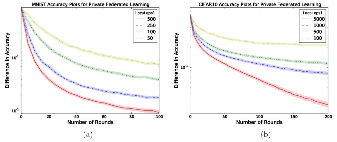 图 3. 隐私保护联邦学习(由隐私参数ε1 索引)与非隐私保护模型更新的图像分类准确度比较.