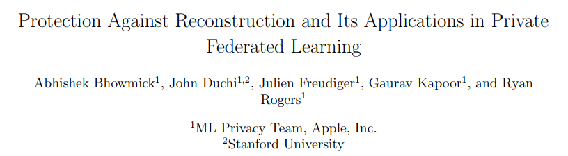 https://arxiv.org/pdf/1812.00984.pdf,Protection Against Reconstruction and Its Applications in Private Federated Learning,提出了一种差异性隐私保护方法。