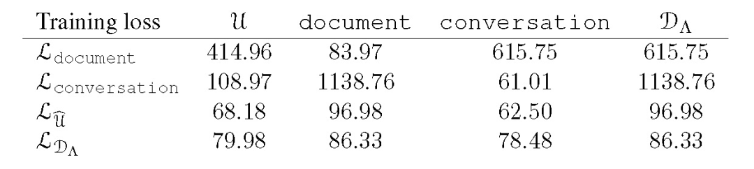 该数据库仅包含两种语言数据:对话和文本。对话数据使用的是 Cornell 电影数据库,其中包含了 300000 条语句,平均长度为 8。文本数据使用 Penn TreeBank(PTB)数据库,包含 50000 条语句,平均长度为 20。本文通过将上述两个对话和文本语料库作为域相结合构建了一个数据库。本文使用动量优化器(momentum optimizaer)训练了一个投影大小为 512 的双层 LSTM 模型。通过复杂度来衡量模型的效果,即交叉熵损失的指数,实验结果见表 3。在这两个域中,文本域的处理难度较大,AFL 的测试复杂度接近于仅针对文本数据训练的模型,优于基于均匀分布 u^训练的模型。