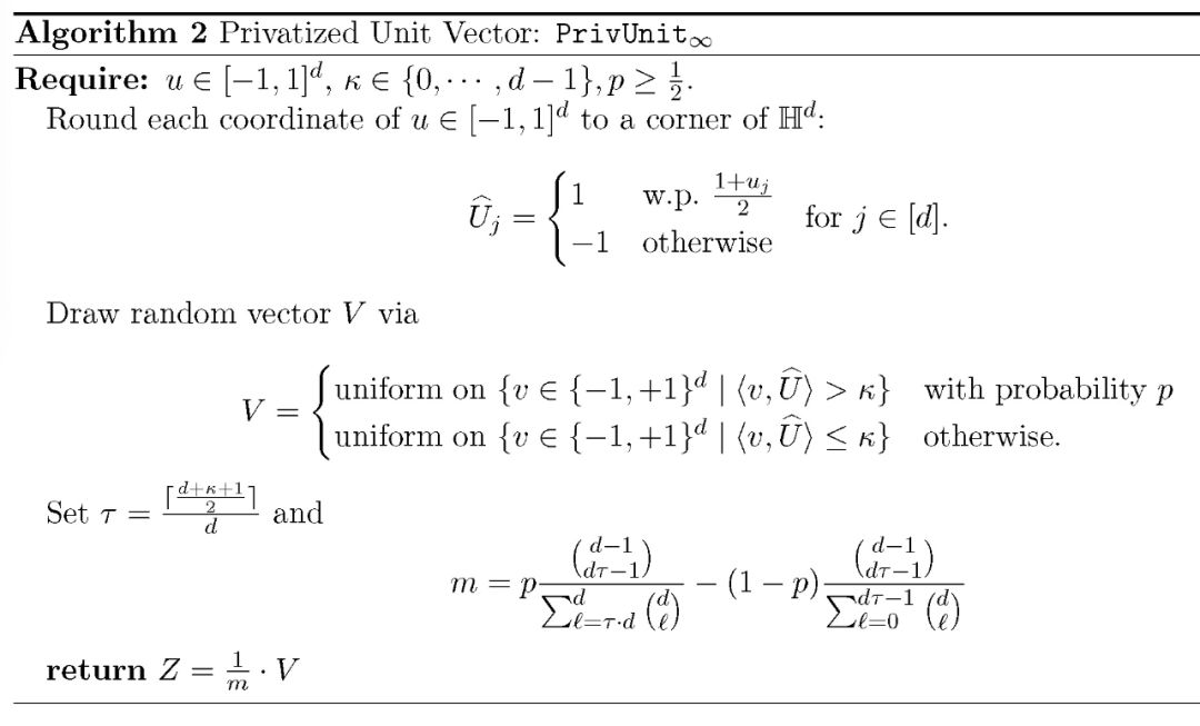影响联邦学习效率的一个关键指标是模型的更新 delta 的精度,通常该值为随机梯度 delta l(theta;x) 的计算结果。本文专门考虑了两种情况下更新准确度的情况,包括:欧式距离情况(对输入单位向量 u 进行重采样,从 L_2 阴影球形中均匀选择),以及在高维估计优化问题中常见的非欧氏距离的情况(私有化向量到 L_Infinity)。欧氏距离和高维的私有化过程分别见算法 1 和算法 2。