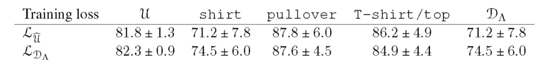 MNIST 数据库包含 60000 个训练图像和 10000 个测试图像,以 28x28 个灰度像素强度阵列的方式存储,同时在 10 个类别中均匀分布。本文首先训练一个简单的逻辑回归分类器,观察到以下三个类别的分类性能最差:T 恤衫/上衣、套头衫和衬衫。接下来,提取了用这三个类别标记的数据子集,并将该子集分成三个域,每个域由一类衣服组成。然后,使用逻辑回归和 Adam 优化器训练针对这 3 个类别的分类器。实验结果见表 2。由于各个域分别给定了标签,在这个实验中,本文没有对比在特定域上训练的模型。在 3 个类别中,衬衫的分类难度最大。与基于均匀分布 u^训练的经典模型相比,AFL 可以提高衬衫类别的整体识别准确度。此外,不可知学习方案不仅改善了难度最大的域内的识别效果,而且具有更好的推广性,提高了平均测试准确度。AFL 模型在任何目标分布 D_lambda 上达到了约 74.5% 的准确度,而经典联邦学习的准确度约为 71.2%。