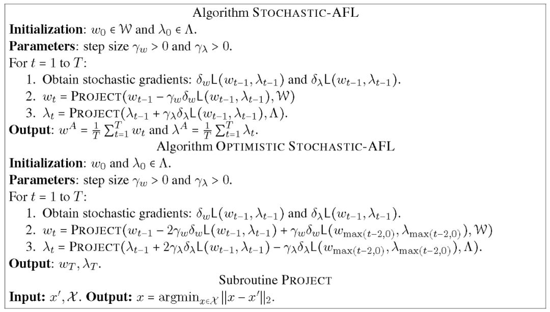 在每一步中算法计算一个关于 lambda 和 w 的随机梯度,并相应地更新模型。然后通过计算凸极小化得到 Lambda 的值从而将 lambda 投影到 Lambda。重复计算 T 次并返回权重的平均值。