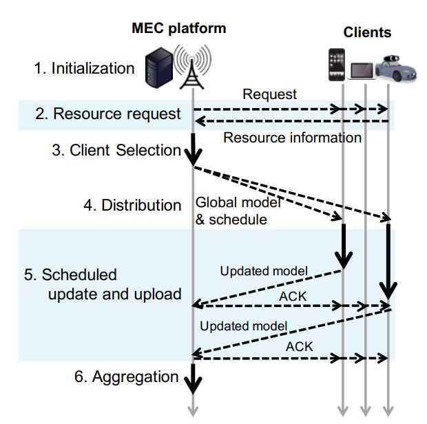 联邦学习的系统异质性问题是指,构成联邦学习网络的各个客户端情况不同,计算资源(计算能力)以及无线信道条件等都存在较大的差异性,进而影响联邦学习的整体性能。本文提出了一个移动边缘计算框架(Mobile Edge Computing,MEC),能够在保护客户端隐私的同时完成客户端模型训练,同时有效解决真实蜂窝网络中的系统异质性问题。本文提出的联邦学习框架(FedCS)能够根据客户端资源条件管理客户端设备,从而有效应对具有资源约束的客户端选择问题,它允许服务器聚合尽可能多的客户端更新信息,并加速改进机器学习模型的性能。
