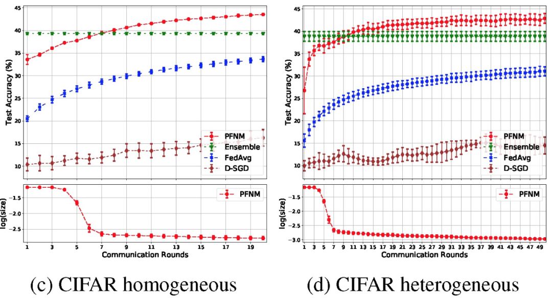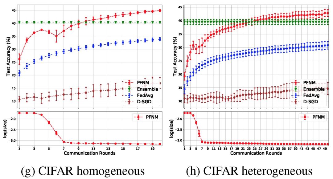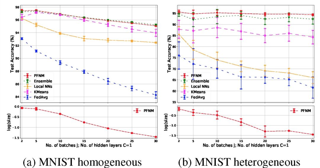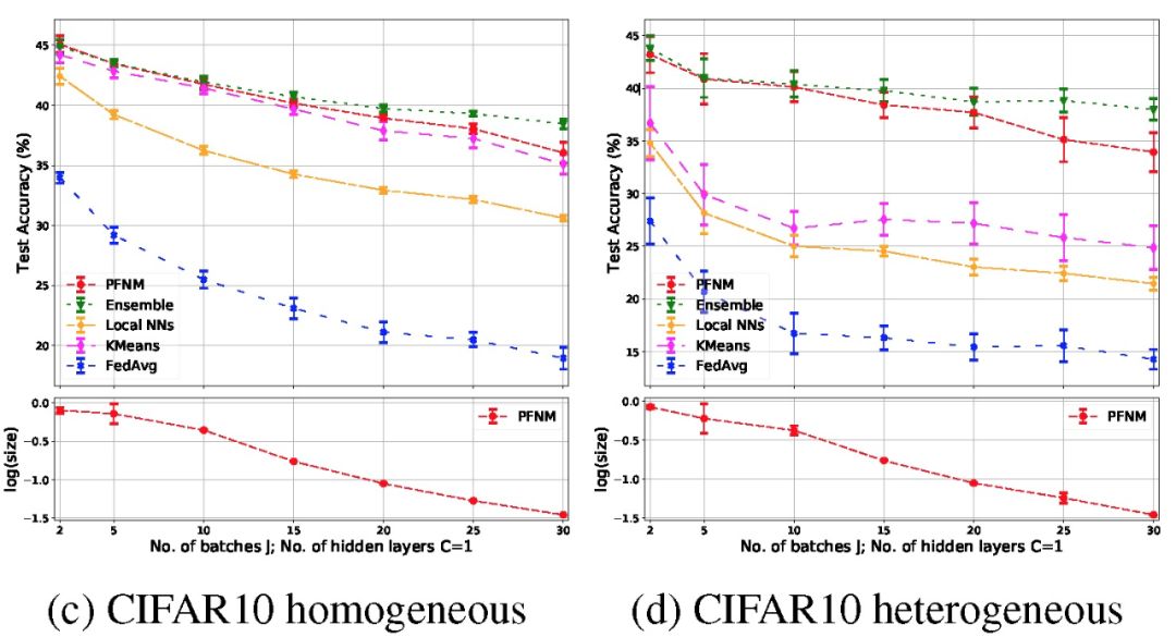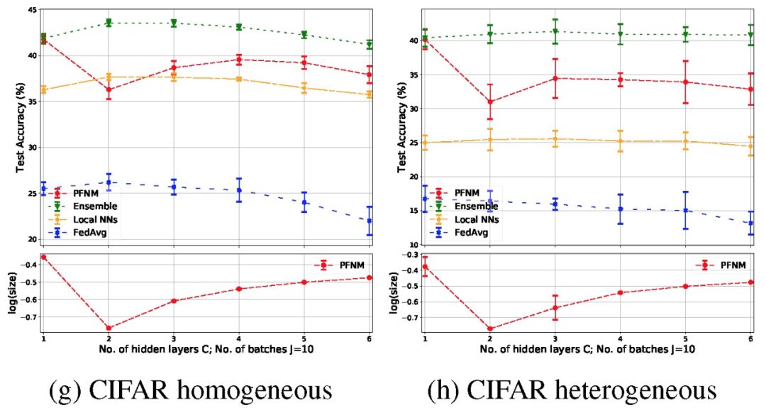 图 3 给出了不同批次的单隐层神经网络结果。在异构分区的实验条件下,我们观察到局部 NNS 和 K-means 的性能明显下降,而 PFNM 能够保持其良好的性能。在讨论聚合性能的问题上,PFNM 与本地模型和联邦学习方法相比,改进也很明显。但是它的性能略逊于聚合方法,特别是针对 CIFAR-10 中较深的网络结构。此外我们也能看到,因为经典联邦学习方法的思路就是通过多轮通信构建全局模型,因此仅执行一轮通信回合,联邦学习方法的效果最差。