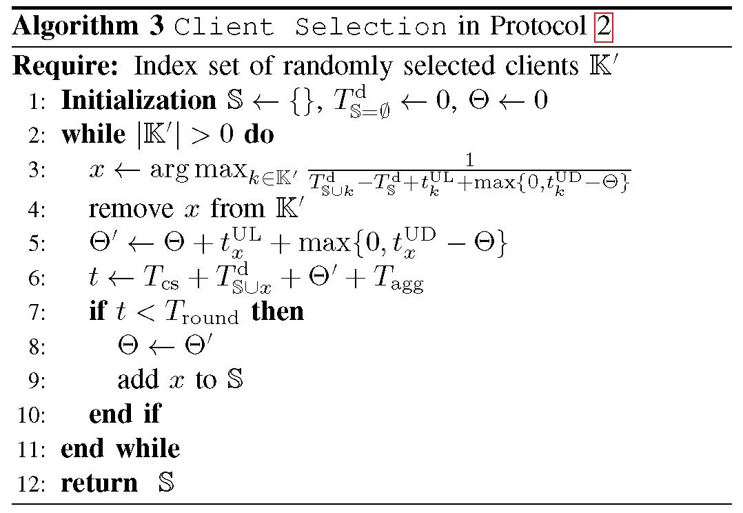 将模型上载和更新操作所用时间最少的客户端迭代添加到 S,直到运行时间 t 达到截止时间 T_round。整个算法中最关键的参数为 T_round,本文将 T_round 设置为较大值,从而能够保证更多的客户端参与到每轮上载和更新中。