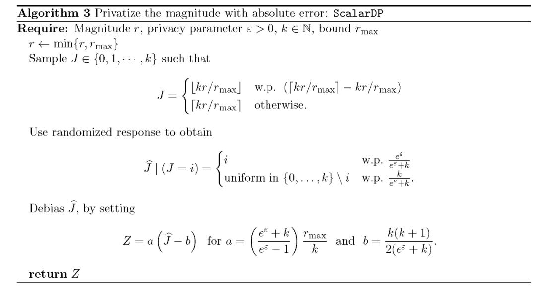 本文对无偏向量释放处理机制的最后一个操作是将 r∈[0,r_max] 的情况释放扩展为 r<Infinity。本文具体介绍了两种方法:一是均方误差阶次最优尺度的随机响应机制,另一种是能够获得更好的相对误差保证的机制。具体见算法 3。