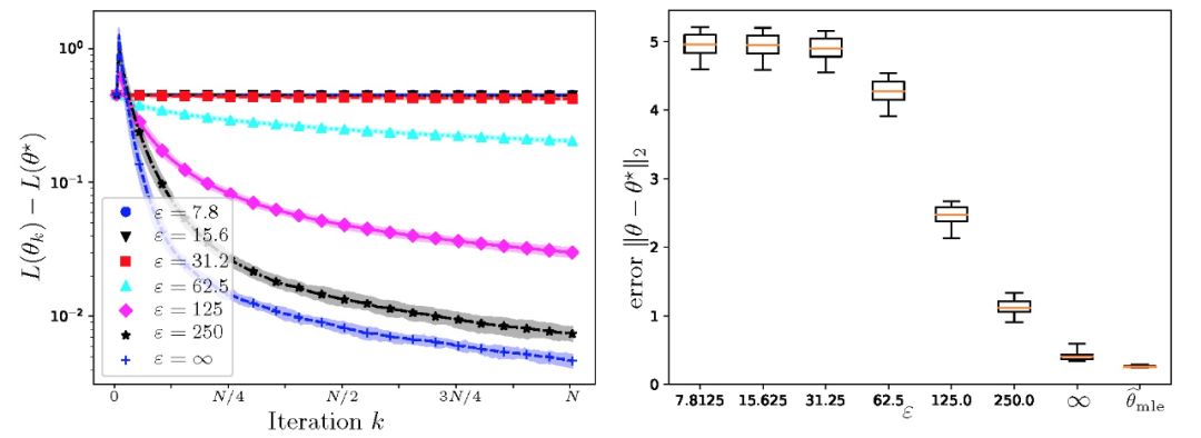 实验结果:具体实验结果见图 2 所示。其中左图给出私有随机梯度法的误差,正如上文所分析,私有随机梯度法对这个问题是(极大极小)最优的。随着 epsilon 值变大,实验效果逐渐接近于非私有化处理的经典随机梯度估计方法。右图给出随机梯度方法和非私有最大似然估计的误差方框图。