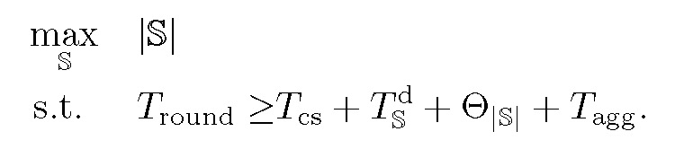 令 K={1,...,K} 表示 K 个客户端的索引,K' 为在资源请求步骤中随机选择的 K 的子集。S 表示所选择的客户端索引,本文目的是对这些索引进行优化。在更新和上载步骤中,客户机按 S 的顺序依次上载其模型。假设 R_+为非负实数集,T_round 为每轮的截止时间,T_final 为最后截止时间,T_cs 和 T_agg 分别为客户端选择和聚合步骤所需的时间。(t_s)^d 表示分发所需的时间,它取决于选定的客户端 S。(t_k)^UD 和 (t_k)^UL 分别表示第 k 个客户端更新和上载模型所花费的时间。通过最大化所选客户端的数量每轮接受尽可能多的客户端更新。从计划更新和上载步骤开始到第 i 个客户端完成更新和上载过程的估计运行时间定义如下: