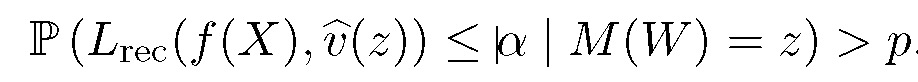 旁观者(或对手)具有先验知识 pi,已知随机映射机制 M:W→Z, W→Z=M(W)。f 为重建目标,L_Rec 为损失函数。估计值 v.^提供一个针对 L_Rec 的 (alpha,p,f) 重建破坏如下: