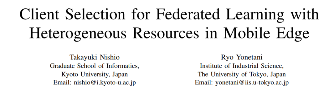 https://arxiv.org/abs/1804.08333,Client selection for federated learning with heterogeneous resources in mobile edge, 提出了一个用于机器学习的移动边缘计算框架,它利用分布式客户端数据和计算资源来训练高性能机器学习模型,同时保留客户端隐私;