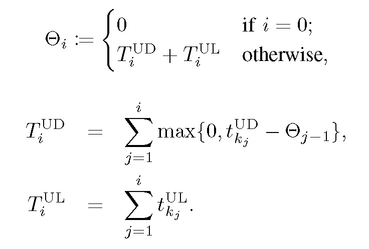 客户端顺序上载,(T_k)^UL 表示 (t_k)^UL 的总和。与之对应,也可以在之前的客户端执行上载步骤时更新模型。这样保证在个别更新时间段内,(t_k)^UD 不会收敛到 (T_i)^UD。客户端选择机制表示为下列最优化问题: