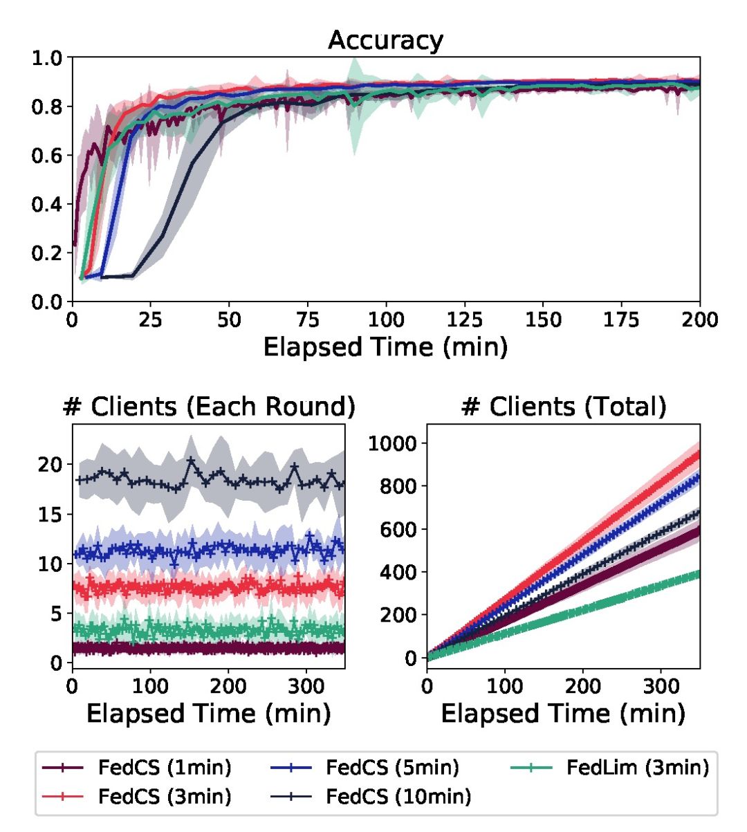 图 2 中实验证明 T_round 的影响。上:精度曲线;左下:每轮选择的客户端数;右下:选择的客户端总数。阴影区域表示 10 次实验之间的性能标准差。由图 2 中实验可知,联邦学习中设置较长的截止时间 T_round 能够引入更多客户端,但是由于聚合步骤较少,能够带来的改进非常有限。相反的设置较短的截止时间 T_round,每轮有限的客户端数量会降低分类准确度。较好的选择 T_round 的方式是每轮动态的变化从而找到有效的客户端数量。这部分内容将是今后研究的重点。
