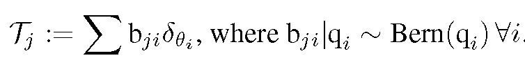 其中每个 theta_i 是由特征提取器权重偏差对与 softmax 回归的相应权重形成的级联向量。本文使用「batch」来表示数据的一个分区。接下来,对于每个 j=1,...,J,通过 Bernoulli 过程为 batch j 选择全局原子的子集:
