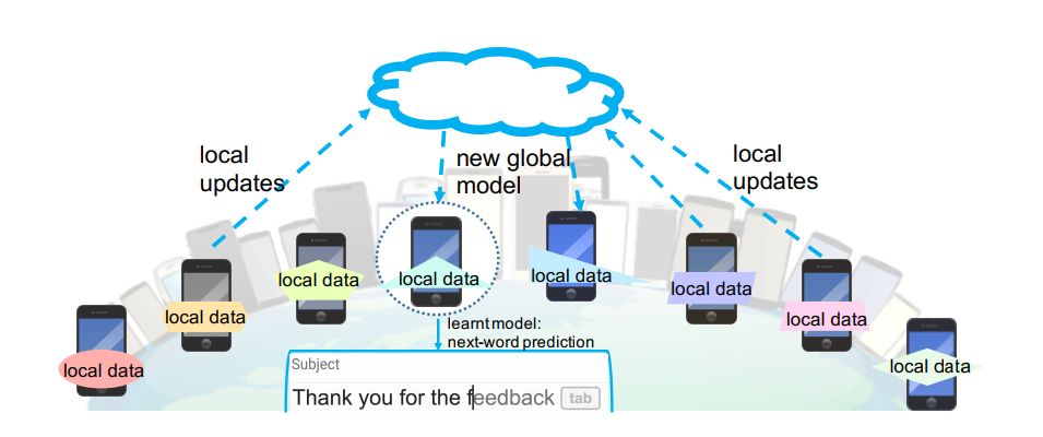 下图为联邦学习在手机中输入的下一个词预测任务中的应用实例 [1]。为了保护文本数据的隐私性并减少对通信网络产生的压力,联邦学习以分布式的方式训练预测器,而不是将原始数据发送到中央服务器集中训练。在此设置中,远程设备定期与中央服务器通信以构建全局模型。在每个通信回合中,所选手机终端的一个子集对其非独立同分布的用户数据执行本地训练,并将这些本地更新发送到中央服务器。汇聚更新后,中央服务器将新的全局模型发送回其它设备子集。这个迭代训练过程在整个网络中持续,直到达到收敛或满足某种终止标准。