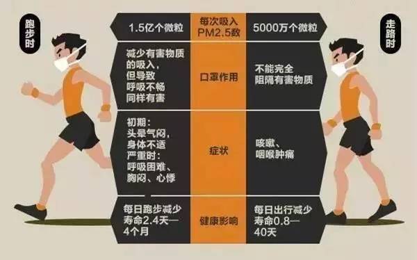 对于雾霾带来的危害,可能没有谁会比中国的城市居民更有发言权。来自《美国医学会杂志》的研究表明,PM2.5会导致动脉斑块沉积,引发血管炎症和动脉粥样硬化,最终导致心脏病或其他心血管问题。一个更为直观的表述是,在雾霾天户外走路2小时,会吸入约5000万个PM2.5微粒,根据污染程度的不同,寿命会减少0.8~40天,而如果选择每天跑步2小时,则会吸入超过1.5亿个PM2.5微粒,寿命最多减少4个月——也就是说,跑步一分钟,寿命少一天。