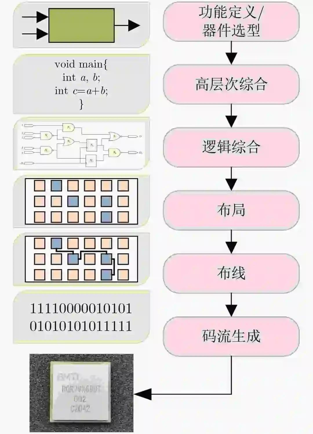 作为FPGA芯片设计、应用过程中不可或缺的重要组成部分,在过去的30余年中,FPGA EDA的设计流程变得越来越规范且复杂,具体包括高层次综合(High Level Synthesis, HLS)、逻辑综合、布局、布线以及码流生成[17,18],如图1所示。