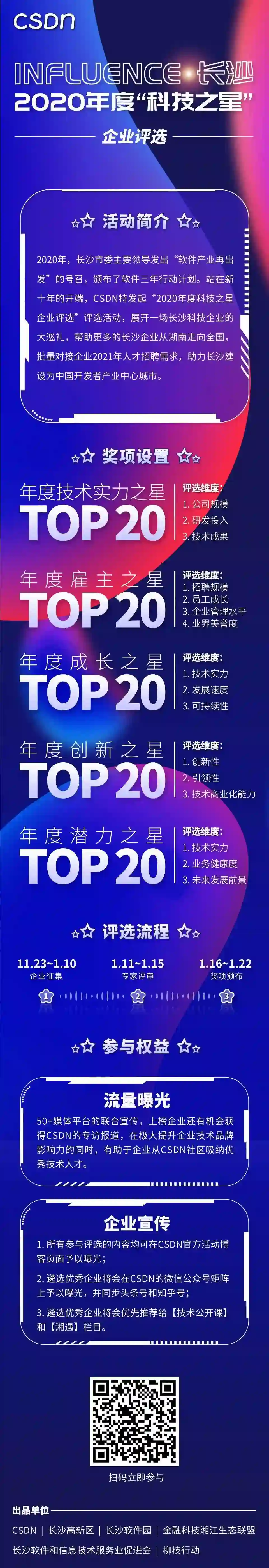 站在新十年的开端,CSDN特发起“2020年度科技之星企业评选”评选活动,展开一场长沙科技企业的大巡礼。本次评选活动分为自主报名、榜单公布两个环节。最终评选产生年度技术实力之星、年度雇主之星、年度成长之星、年度创新之星、年度潜力之星五大奖项。通过协同各方力量,从业务联合创新、人才引进培养、中小企业扶持等几大层面助力长沙科技产业的加速发展,合力共建“智慧产业生态圈”。