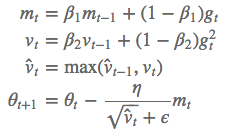 为了解决这个问题,作者提出了一种新的算法AMSGrad,它使用过去平方梯度的最大值而不是指数平均值来更新参数。完整的AMSGrad更新没有偏差修正的估计,如下所示: