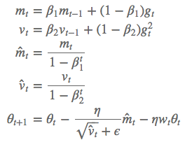 权重衰减通常在许多神经网络库中都被实现,或者作为上述正则化项或者直接修改梯度。当动量和Adam更新方程(通过与其他衰减项相乘)中的梯度被修改时,权重衰减不再等于L2正则项。因此,Loshchilov和Hutter(2017)[19] 提出通过在参数更新之后添加它来解耦梯度更新中的权重衰减,就像在原始定义中那样。