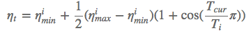 SGDR(Loshchilov andHutter,2017)[6] 是近期提出的一个有效的方法,这是一种使用热重启替代学习速率退火的SGD方法。在每次重新启动时,学习速率被初始化为某个值,并且将减少。重要的是,重启是热重启,因为优化不是从头开始,而是从最后一个步骤中模型收敛的参数开始。关键因素是用积极的余弦退火方案使学习率下降,这会迅速降低学习率,如下所示: