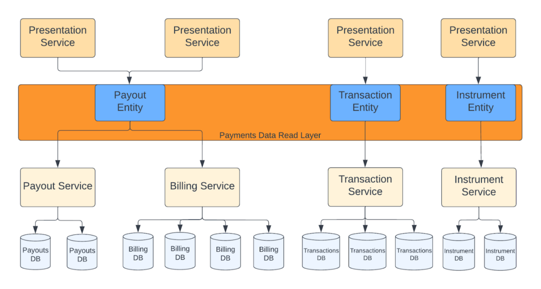 迁移到 SOA 架构后支付数据的读取流程。呈现服务调用一个或多个支付服务,并在应用层聚合数据
