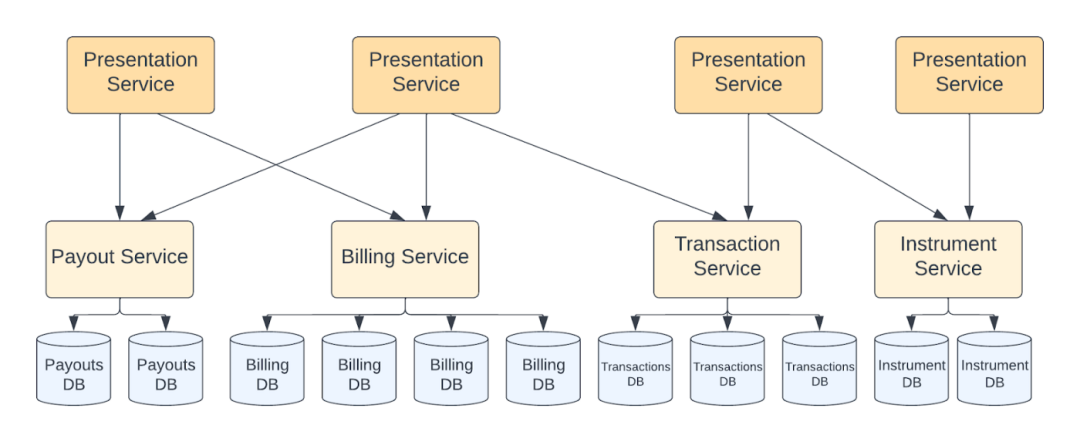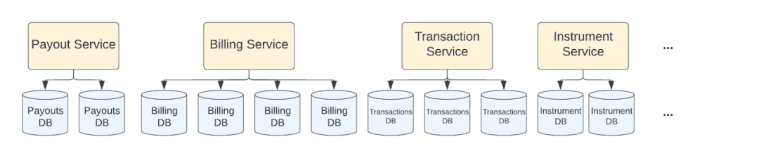 在迁移到 SOA 架构之后,每个支付子领域都有自己的服务和数据表,但更多的特性意味着更复杂和规范化的数据。
