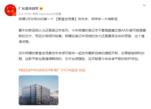 据数码博主@厂长是关同学 爆料,荣耀将在 5 月举办第一个智慧全场景发布会,除发布笔记本系列外, 还有望推出最新品类的旗舰平板,可能是今年安卓平板的标杆存在。值得注意的是,该博主透露, 荣耀全新的旗舰平板可能会搭载联发科全新迅鲲处理器,为天玑 9000 的增频版。