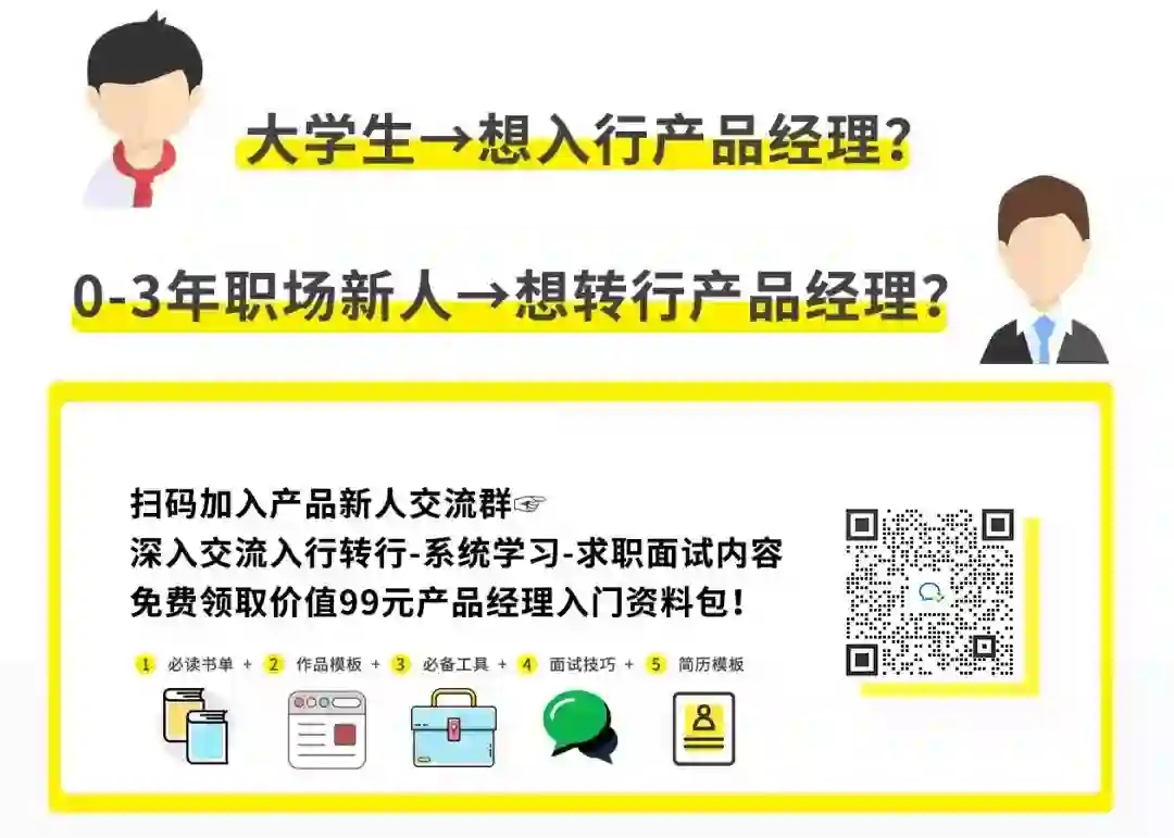 同时,我们还准备了产品经理入门资料包(包含产品入门书、作品、工具、面试技巧、简历模板等),扫描下方二维码即可入群获取,希望能在你学习的过程中助你一臂之力。