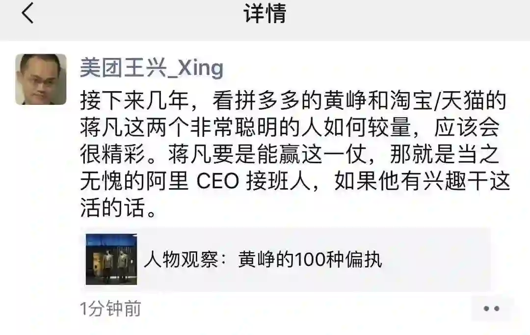 今晚,王兴在朋友圈转发一篇关于黄峥的文章时突然点评了拼多多创始人黄峥和淘宝总裁的蒋凡,他表示二人都是非常聪明的人,未来的较量应该会很精彩。王兴还进一步指出,“蒋凡要是能赢这一仗,那就是当之无愧的阿里CEO接班人,如果他有兴趣干这活的话”。