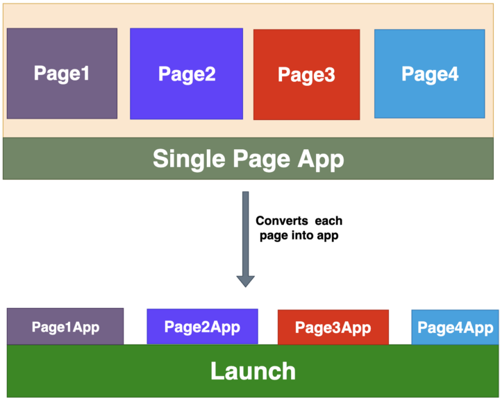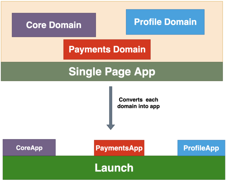 这是最常见的方法,因为我们可以很容易地划分应用的功能。例如,如果应用有三个特性,分别是 Dashboard、Profile 和 Views,我们可以将每个特性作为一个单独的应用,并在 Launch.js 的辅助下在 DOM 中挂载和卸载它们。这个 Launch.js 可以是一个独立的应用,也可以只是一个简单的 JavaScript 应用。