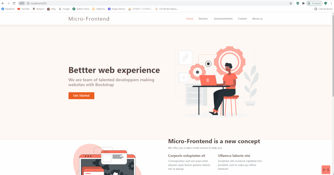 // root app runs on port 4200git clone https://github.com/ahmedbhl/micro-root.gitnpm installnpm start// micro header runs on port 4300git clone https://github.com/ahmedbhl/micro-header.gitnpm installnpm start// micro dashboard runs on port 4202git clone https://github.com/ahmedbhl/micro-dashboard.gitnpm installnpm start// micro footer runs on port 4201git clone https://github.com/ahmedbhl/micro-footer.gitnpm installnpm start