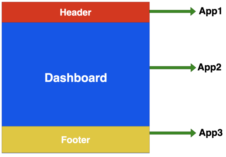 我们将按下图所示,把这个应用分成多个组成部分。我们一共要实现 4 个应用,分别是 HeaderApp、DashboardApp、FooterApp 和根应用。