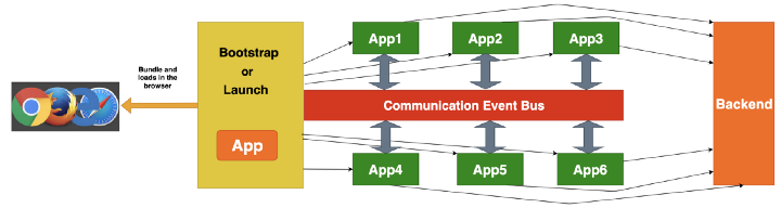 如上图所示,我们有 6 个前端应用互相协作来交付一个更大的应用。这些应用之间的通信可以借助事件总线、window 对象或发布 / 订阅方法来实现。每个应用都可以由不同的团队和任意框架实现。每个应用都可以独立地与其后端或端点进行交互。这里有一个 bootstrap/launch 应用,它会负责加载所有其他的应用,并根据用户的交互或路由在 DOM 中挂载或卸载它们。