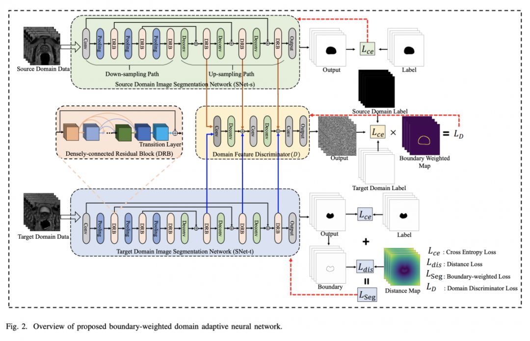 本文提出了一种新的分割网络——BOWDA Net。基于此网络,作者在 MICCAI 2012 前列腺分割竞赛中排行第一,结果为 state of the art。创新点有两点:1)针对前列腺 MR 图像边界不清晰的问题,提出了边界加权分割 loss,平滑了边界;2)针对数据集小的问题,作者借鉴了迁移学习以及 GAN 的思想,解决了 source domain 和 target domain shift 的问题,值得阅读。
