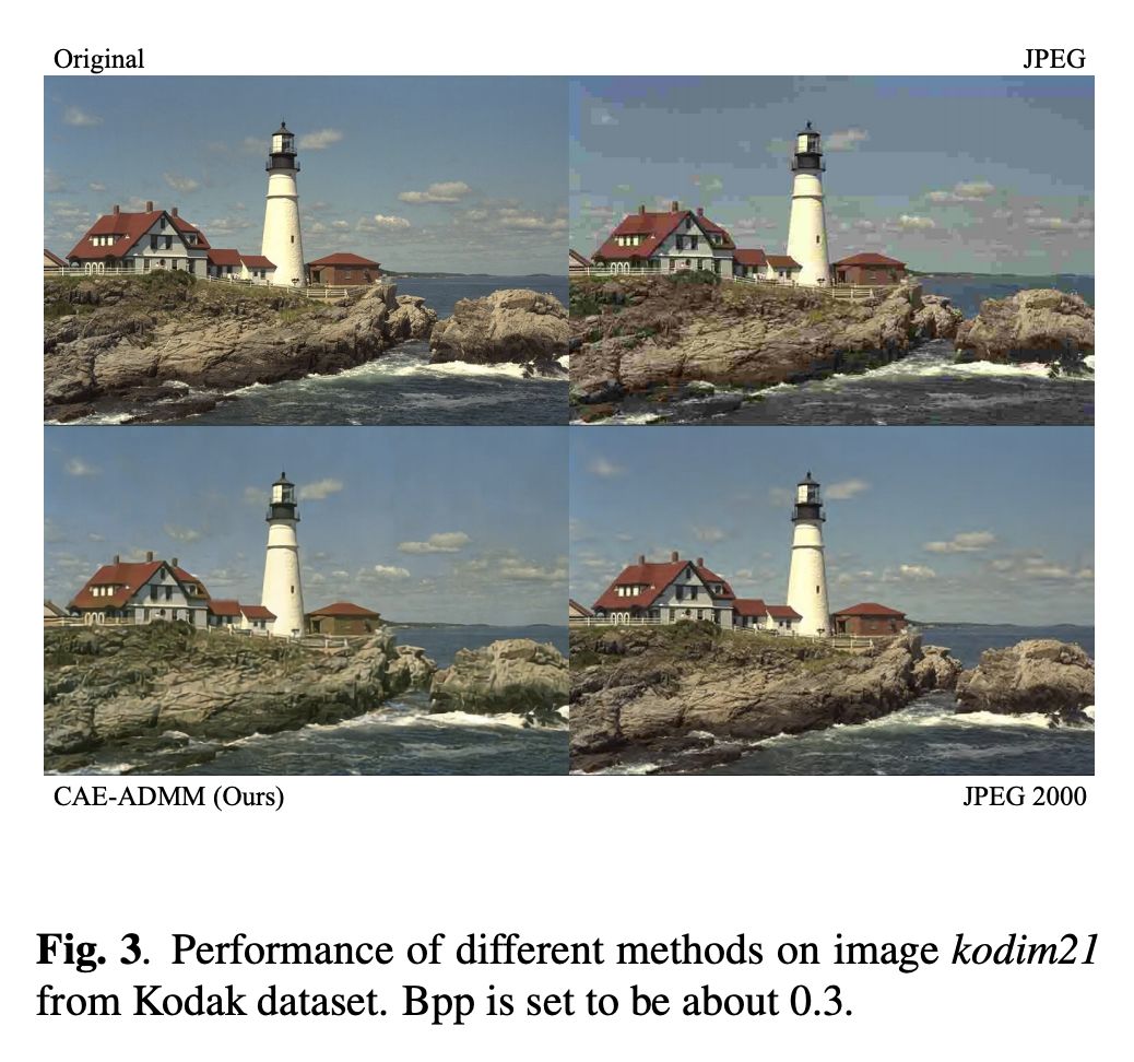 该研究则引入了来自神经网络架构搜索领域的网络剪枝方法,提出了 CAE-ADMM 模型,直接对压缩后的编码进行剪枝,在保持编码速度的情况下,SSIM 及 MS-SSIM 的表现均超越了使用熵估计器的现有模型和传统编码器(JPEG、JPEG 2000 等)。该研究同时对引入的剪枝方法在模型中的效果进行了检验。
