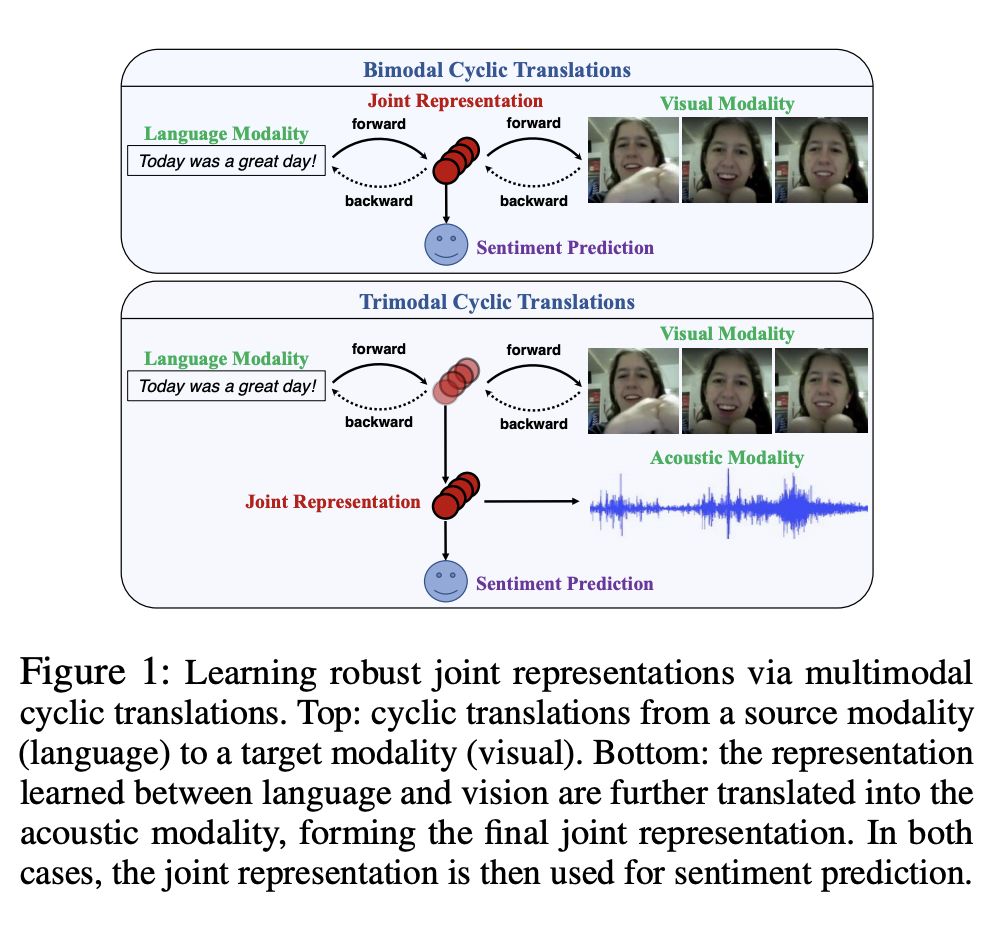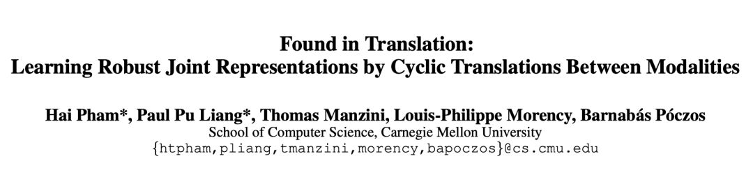 本文是 CMU 的 MultiComp Lab 发表在 AAAI 2019 上的工作。多模态情感分析是 NLP 的一个新的核心研究领域,研究从语言、视觉和声学模态表达的说话人情绪。多模式学习的核心挑战涉及可以处理和关联这些模态信息的推断联合表示。然而,现有工作通过要求所有模态作为输入来学习联合表示,因此,学习的表示可能对测试时的噪声或丢失模态敏感。