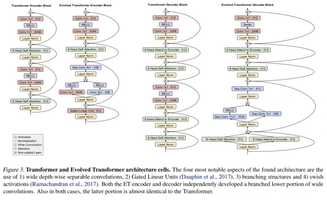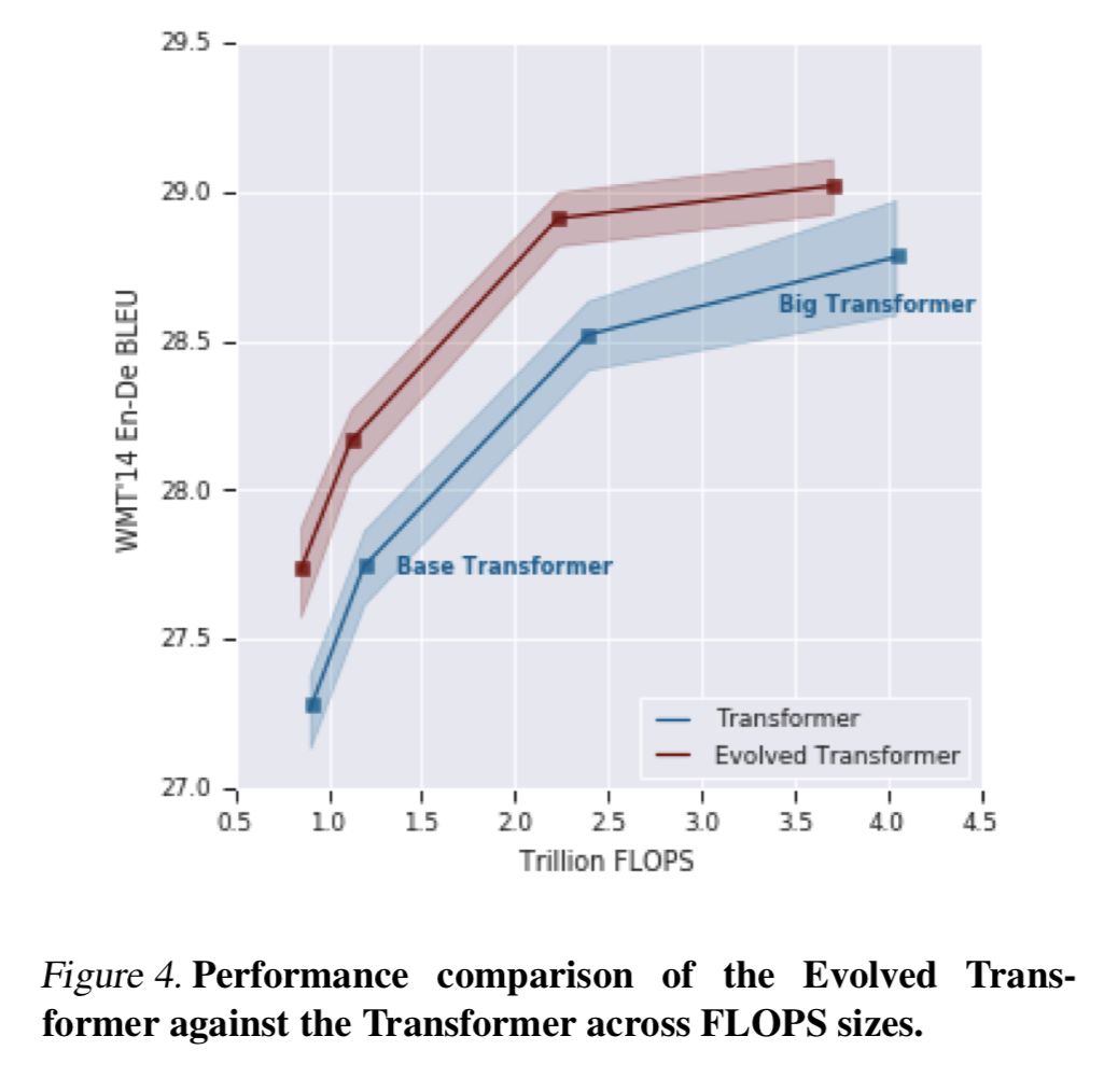 本文来自 Google Brain,论文提出了 progressive dynamic hurdles (PDH) 神经网络架构搜索方法,此方法能够动态的把资源分配到相对优秀的候选者,最终得到“Evolved Transformer”,其在几个翻译任务(WMT 2014 English-German, WMT 2014 English-French, WMT 2014 English-Czech, LM1B)相对原始 Transformer 有一致的提升,并且有更高的计算效率和更少的参数量。