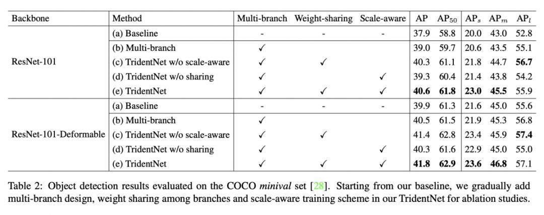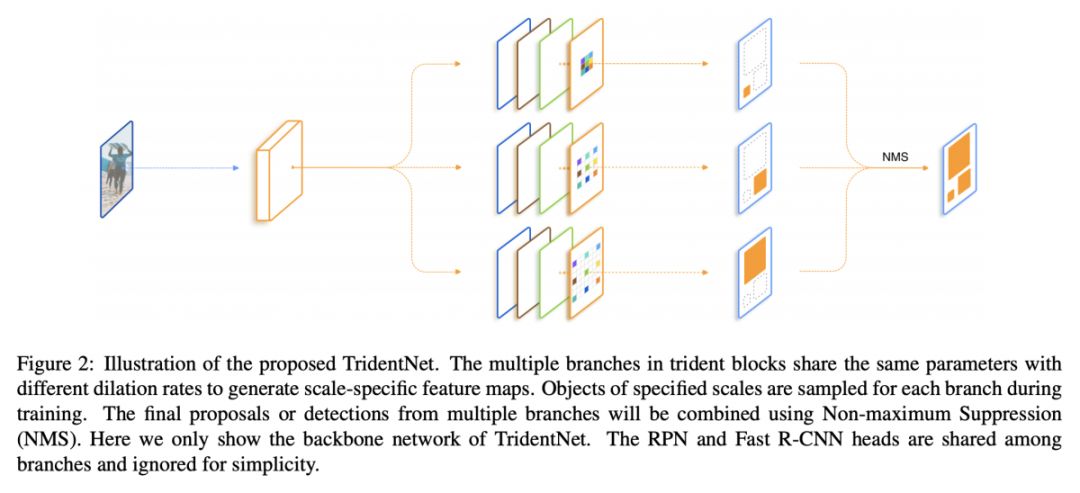为了使模型对不同尺寸目标的“表达能力”近似,作者借鉴了 SNIP 的特征提取网络,采用了“scale-aware”的并行结构。为了加快模型的推理速度,作者采用了 dilated convolution 得到不同感受野的特征图,从而实现检测不同尺度目标的目的,取代了 SNIP 中的特征金字塔生成不同尺度目标的做法。