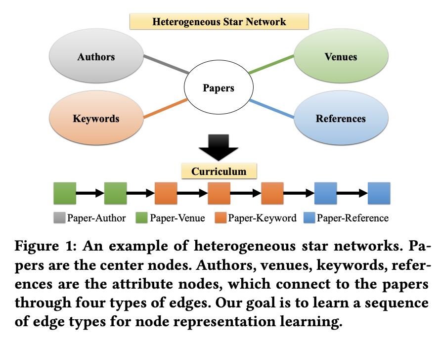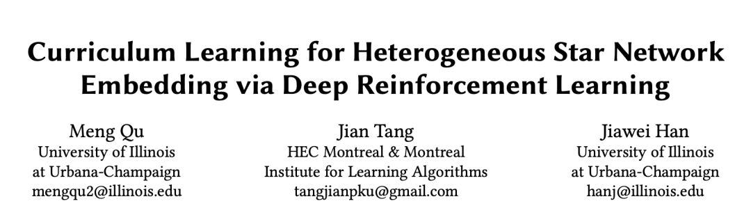 本文是 UIUC 和 HEC Montreal 发表于 WSDM 2018 的工作,论文开创性地将强化学习思想应用到星型异构网络节点表示学习当中 ,利用马尔科夫链去获取最优的节点之间边的序列。作者将奖励计算作为节点表示的外部任务的性能作为特征,目标是采取一系列行动来最大化累积奖励,基于长短记忆网络利用深度强化学习模型,完成网络表示学习。
