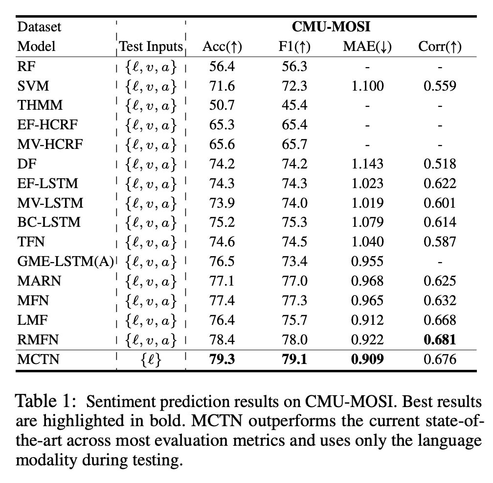 我们使用耦合的翻译预测目标训练我们的模型,并在多模态情绪分析数据集上实现新的最新结果:CMU-MOSI,ICT-MMMO 和 YouTube。 另外的实验表明,我们的模型学习越来越多的判别性联合表示,具有更多的输入模态,同时保持对丢失或扰动模态的鲁棒性。