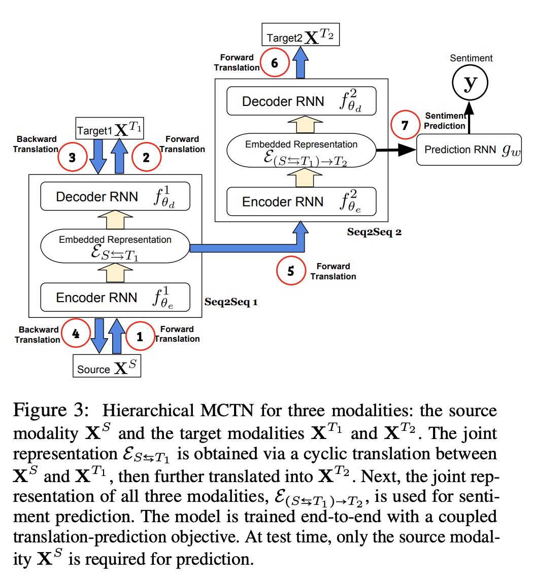 论文使用周期一致性损失来增加模态转换,以确保联合表示保留所有模态的最大信息。一旦翻译模型使用配对的多模态数据进行训练,我们只需要在测试时从源模态获得最终情绪预测的数据。这确保了我们的模型在其他模态中不受扰动或缺失信息的影响。