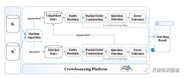 首先,通过机器学习方法对知识库进行粗略的实体对齐,然后分别将以对齐实体对(MatchedPairs)和未对齐实体对(UnmatchedPairs)放入众包平台,让人进行判断。两条流水线的步骤类似,主要包括四个部分:实体集划分(EntityPartition)、建立偏序(PartialOrder Construction)、问题选择(QuestionSelection)、容错处理(ErrorTolerance)。