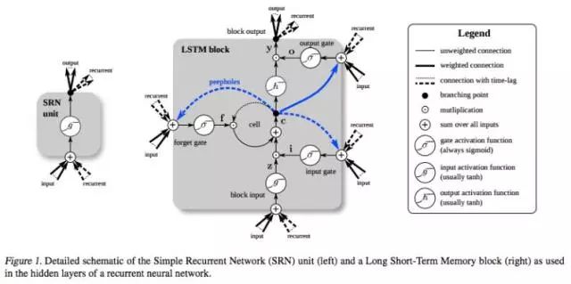 下面是另一张图,将简单循环网络(左)与LSTM单元(右)进行对比。蓝线可忽略;图例有助理解。